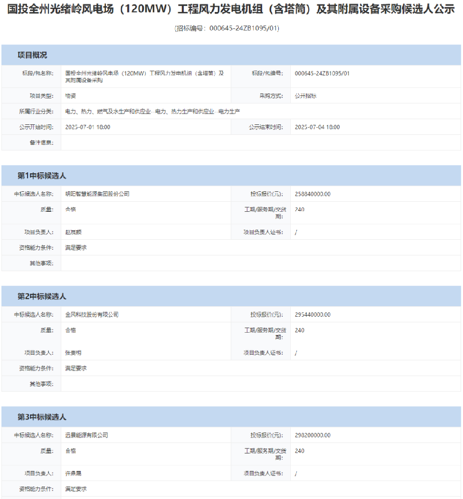 7月1日,國投全州光緒嶺風電場(120MW)工程風力發(fā)電機組(含塔筒)及其附屬設備采購候選人公示,明陽智能預中標,投標報價25884萬元。 項目概況:國投全州光緒嶺風電場(以下簡稱“光緒嶺風電場”)規(guī)劃場址區(qū)位于廣西壯族自治區(qū)桂林市全州縣龍水鎮(zhèn)、永歲鎮(zhèn)、黃沙河鎮(zhèn)、全州鎮(zhèn)一帶的山脊和山包區(qū)域,地理位置為東經111°1′34.63"~111°13′37.67",北緯25°59′6.74"~26°2′36.12"之間,海拔高度約450m~910m,規(guī)劃區(qū)域東西長約19km,南北寬約9.3km。場址區(qū)域屬山地丘陵地貌,地形較復雜。山頂一般較狹窄,部份寬緩,山脊兩側山坡地形陡峭,沖溝發(fā)育,山坡自然坡度25°~35°不等,局部達40°~60°,植被較繁密,少量種植杉樹,未植樹地段則長滿茅草、剌叢、雜木及灌木等。本期規(guī)劃24臺風機機位,總容量120MW。