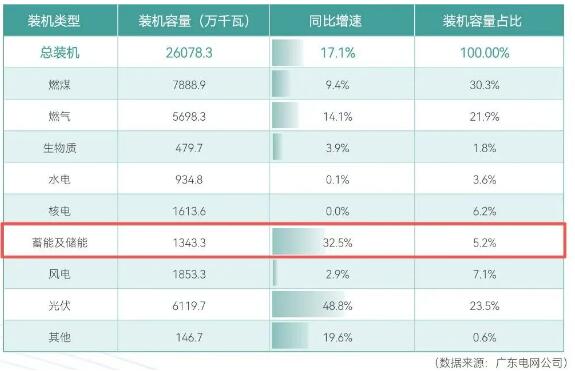 截至2025年底,廣東電網(wǎng)統(tǒng)調(diào)裝機(jī)容量2.608億千瓦,同比增長17.1%,其中中調(diào)裝機(jī)容量1.790億千瓦,地調(diào)裝機(jī)容量0.818億千瓦;全省發(fā)受電量合計(jì)9293億千瓦時(shí),同比增長5.0%。蓄能及儲能裝機(jī)容量1343.3萬千瓦(13.43GW),同比增長32.5%。裝機(jī)容量占統(tǒng)調(diào)裝機(jī)總?cè)萘康?.2%。