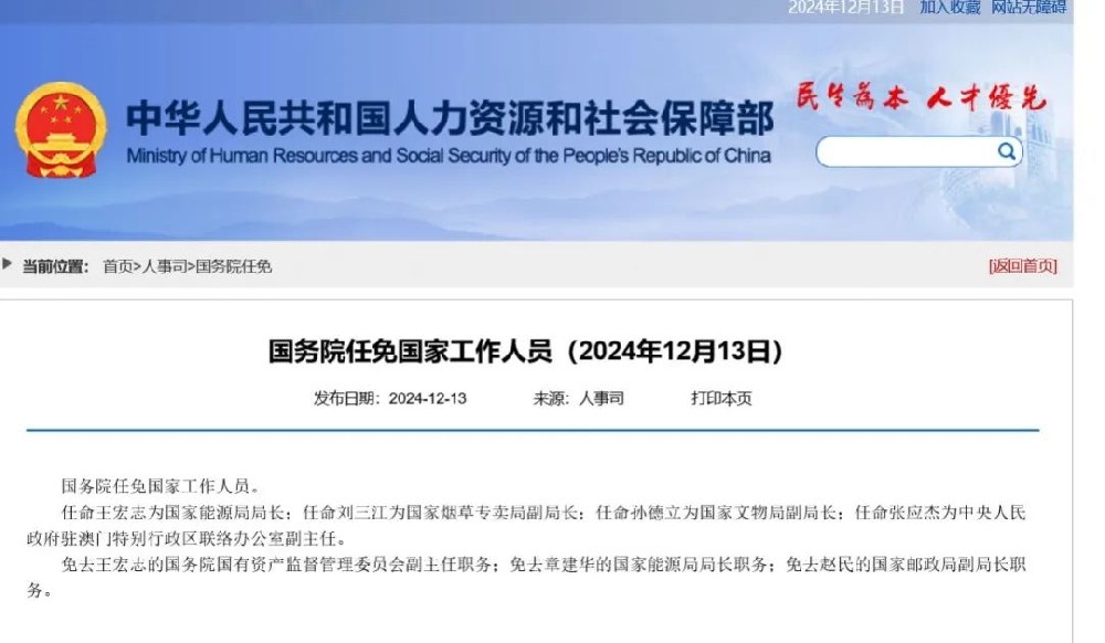 據(jù)人社部網(wǎng)站12月13日消息,國務(wù)院任免國家工作人員。其中,任命王宏志為國家能源局局長,免去章建華的國家能源局局長職務(wù)。