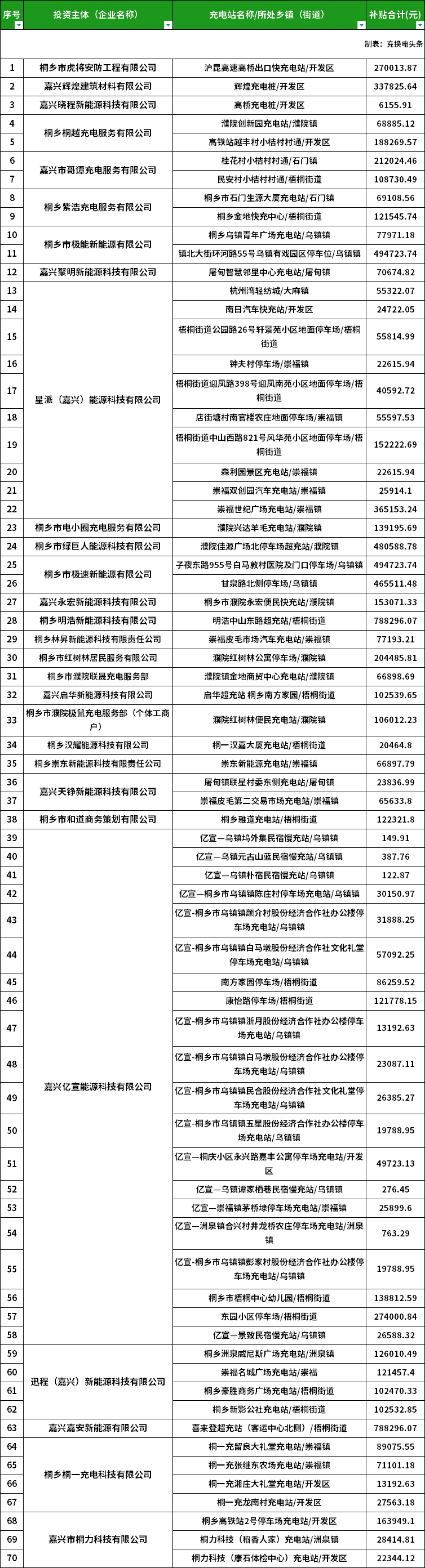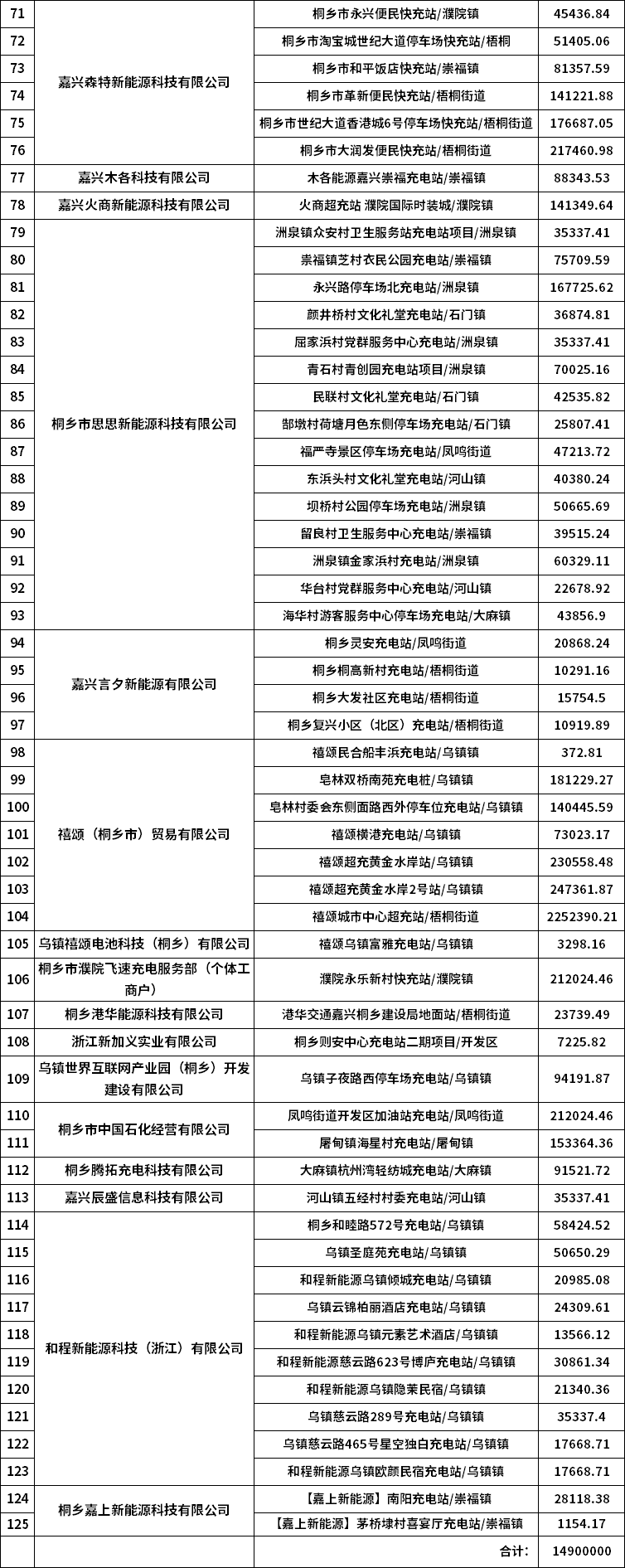 根據(jù)2024年度第二批新能源汽車充電基礎(chǔ)設(shè)施獎(jiǎng)勵(lì)資金二次公示名單顯示,桐鄉(xiāng)市虎將安防工程有限公司、嘉興輝煌建筑材料有限公司、嘉興曉程新能源科技有限公司、桐鄉(xiāng)桐越充電服務(wù)有限公司、嘉興市哥譚充電服務(wù)有限公司、桐鄉(xiāng)紫浩充電服務(wù)有限公司、桐鄉(xiāng)市極能新能源有限公司、嘉興聚明新能源科技有限公司、星派(嘉興)能源科技有限公司、桐鄉(xiāng)市電小圈充電服務(wù)有限公司、桐鄉(xiāng)市綠巨人能源科技有限公司等44家企業(yè),125座充電站獲獎(jiǎng)補(bǔ)資金。